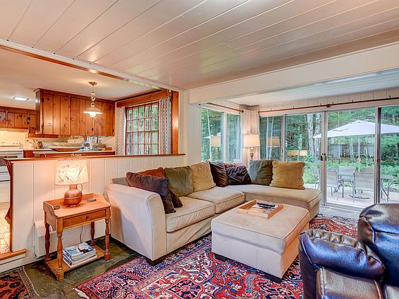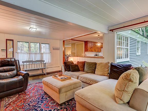 Delayed Showings - they being 11/25/24. Seasonal Rental December 1-June 4th for $16,800. Adorable and charming rental in prime North Conway location. Fully furnished and ready to move in, enjoy this ski season less than two miles to the base of Cranmore Mountain! This cottage cape is clean, cozy and has been incredibly well maintained. The living room features an inviting sectional sofa with wood burning fireplace and large brick hearth. The large windows with glass sliders leading out to the back patio and level backyard. The kitchen is nicely sized with tons of cabinet and counter space and fully equipped, ready for your home cooked cozy winter meals. The formal dining room off the kitchen is a wonderful space to gather with friends and family. The primary bedroom is comfortable with a convenient half bath, and the second bedroom is spacious with a wall of built-ins for great closet space. Also in the hall is a shared full bathroom. The garage provides extra storage and convenience for your vehicle in the winter months. Come and see!
