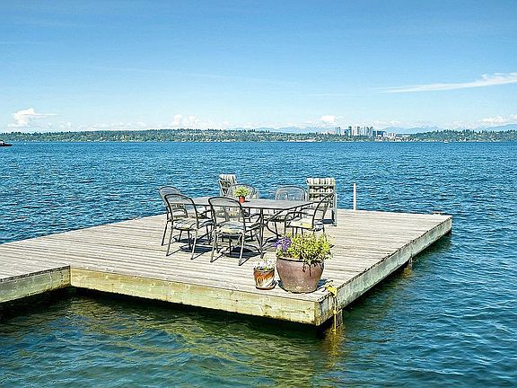 Amazing Leschi top floor waterfront condo with panoramic views of Lake Washington, Mt Rainier, Bellevue & Mercer Island. This end-unit features windows on 3 sides plus two skylights to bring in abundant light. Perfect for entertaining, the floorpan features an open galley kitchen, central fireplace, wet bar, spacious dining area & covered patio. Private dock is the perfect tranquil escape. This iconic home is ready for your modern bath & kitchen updates. Master suite features front and center view of lake, two closets, attached covered patio with access to full bath. The full bathroom features 2 sinks and a spacious walk-in shower. The 2nd bedroom features a skylight, South facing view of lake and Mt. Rainier and also has direct access to the shared full bath. Including the powder room half bath, full bath and wet bar, there are 5 sinks total in the unit. Just a few blocks to Leschi restaurants, Leschi market, coffee and other businesses, parks, public dock, the neighborhood is well known as a place visit and even better to live in.