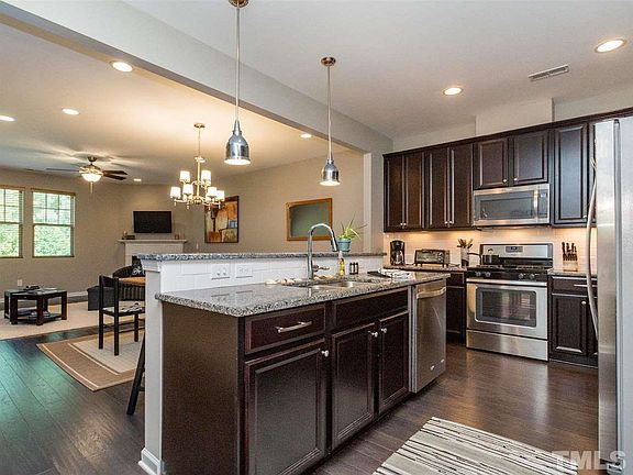 WHAT A LOCATION! Very gently lived in 3 BR + 2.5 baths + loft TH w/1-car garage in RTP. Convenient to 1-40, I-540, 147, RTP, RDU & downtown Durham & Raleigh. Granite countertops, tile backsplash, SS appliances, plenty of 42" cabinets, island kitchen w/pendants & breakfast bar--perfect for entertaining & cooking, gas log fireplace, wood floors on 1st level. Laundry ROOM (not closet). Patio for grilling! This is a lovely community which includes a pool & walking trails. Parking lot across from this home.