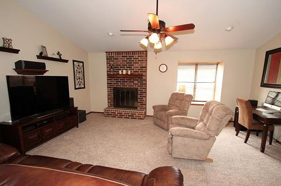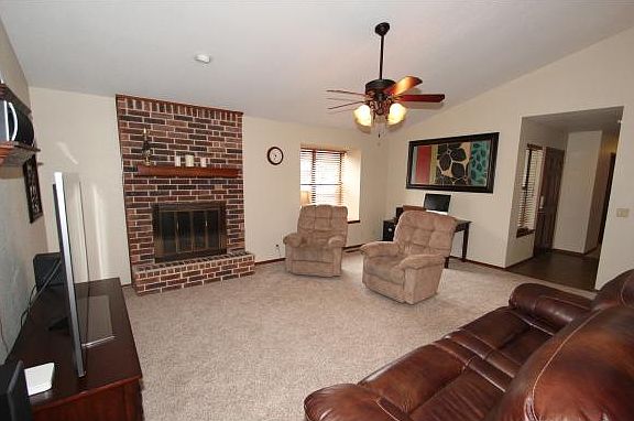 Great west side location with easy access to I-35, shopping/dining. Truman schools. 2014 updates: new carpet, new hand scraped hard wood floor in dining room, & new tile floors in both baths. New roof, ext paint & guttering in June 2013. Living room has a vaulted ceiling, gas log fireplace & wet bar. Walk-in closets in all bedrooms. French doors lead out to a spacious backyard with covered patio, extended concrete deck, storage shed and mature trees.