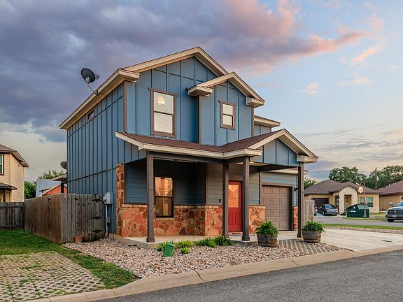 Successful and affordable short-term rental that sleeps 8. Built in 2012, this 3-bedroom, 2.5-bath home offers 1,619 sq. ft. of thoughtfully designed living space, making it equally perfect as a full-time residence, weekend retreat, or a proven short-term rental. From the moment you arrive, the home’s curb appeal stands out with its striking blue board-and-batten siding, stone accents, covered front porch, and landscaped entry. A fenced backyard offers both privacy and a cozy retreat, complete with a small covered back porch and patio—perfect for relaxing evenings or morning coffee without the hassle of yard maintenance. Inside, the open-concept floor plan welcomes you with high ceilings, abundant natural light, and tasteful finishes throughout. The spacious living and dining areas flow seamlessly into the stylish kitchen, complemented by a cozy breakfast nook and convenient laundry room. Upstairs, the primary suite features a walk-in closet and private bath, while two additional bedrooms share a well-appointed bathroom. This property is truly turnkey, conveying with furniture, décor, washer/dryer, refrigerator, TVs, and more—ready to host guests immediately. With an impressive rental history, consistent high occupancy rates, and glowing guest reviews, it stands out as one of the more successful short-term rentals in Fredericksburg. Its central location 2 minutes to the heart of Main Street, wineries, and Hill Country attractions ensures strong demand and repeat bookings year-round. Whether you’re looking for a personal retreat or a high-performing investment, this condo delivers charm, convenience, and income potential in one package.