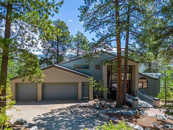 Amazing mountain and valley views from this spectacular Falls Creek Ranch home. This stunning home was built on the rim and overlooks the Animas valley below. The home has so much to offer! On the main level you will find a spacious living room, dining room, kitchen, and laundry room. The main level features a combination of hickory and flagstone flooring, and views from every window. From the dining room you can access the large deck that overlooks the valley, an amazing spot for entertaining or taking in the endless views. Upstairs you will find an office and the primary suite/bedroom. The primary suite is private and all-inclusive living space with a steam shower, double vanity ensuite bathroom; large closet; and access to a large Trex deck with a hot tub. Downstairs you will find 2 large guest bedrooms, a full bathroom, and a large living area with a built-in bar. The home has a lot of other amazing features as well, a large 3 car garage, full A/C, tons of storage areas in the home, an ice melt system built into the roof, and a wine cellar. The home is located in one of Durango's most sought after neighborhoods, Falls Creek Ranch. Falls Creek Ranch offers so much to its residents; horse stables, trails, well maintained roads, a central water system, and large private lake that only the residents and guests have access to. Don't miss this amazing property!