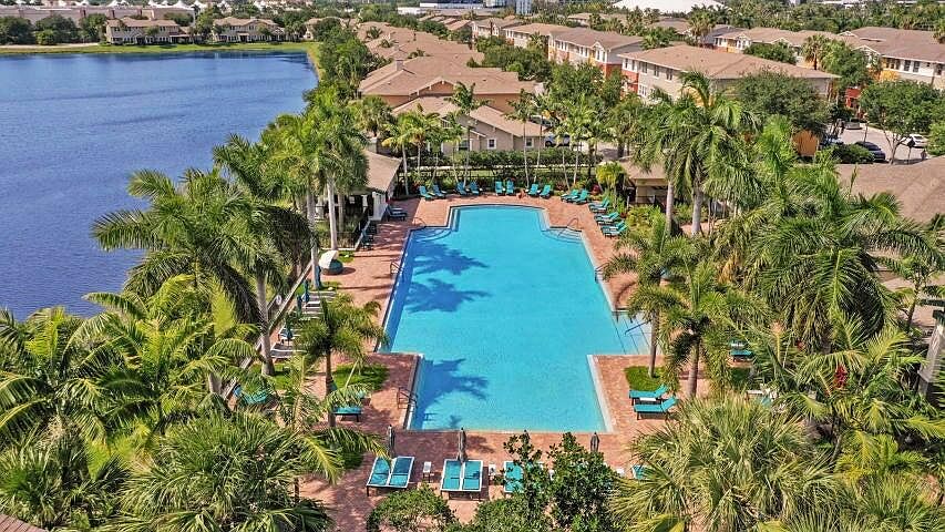 This STUNNING 2 bedroom, 2 bath townhome boasts chic & stylish living. newer kitchen,granite, open floor plan, hurricane impact windows, 10/2025 AC unit, and 2024 water heater. Enjoy high ceilings, a trmendous amount of natural light, a spacious 2-car garage, a separate laundry room with additional storage, and a walk-in closet in the master suite.  24/7 manned gate, an olympic size pool, barbecue area, clubhouse, aerobics room, fitness Center and a one mile Trail around the pond and neighborhood. The location is unbeatable, within walking distance to shopping, Wholefoods, dining, and just minutes from beaches, major highways, downtown, and the airport. HOA includes resort style amenities, water, internet, and basic cable.