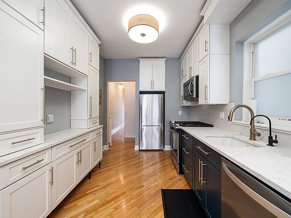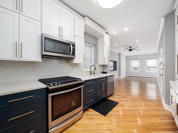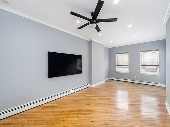 Spacious, bright, and recently renovated 3 bedroom / 2 full bathroom home in the Riverview Arts District of Jersey City Heights. This truly spectacular home features a fully renovated kitchen with custom cabinetry, stainless steel appliance package and quartz countertops. Living/dining room is large and bright, features recessed lighting, high ceilings and crown molding. 3 bedrooms - two at opposite ends of the home and one in the middle perfect for a home office, nursery, or home gym. Both bathrooms are updated with the primary bathroom featuring a soaking tub. Other highlights include high ceilings throughout, sunrise and sunset exposure, hardwood flooring, an abundance of closet storage space, dedicated storage room, free on-site laundry and gorgeous landscaped common yard. Located adjacent to the newly renovated Riverview-Fisk Park, you'll find convenient access to farmers markets, boutique shops, local restaurants, sweeping views of the Manhattan Skyline and Hudson River, the NJ Transit bus to Port Authority, the 9th and Congress Light-Rail stop and elevator into Hoboken.