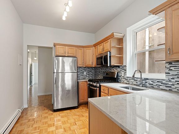 HALF FEE! Beautifully renovated by owners for themselves real 3B/2FB (not a railroad) on one of the most desirable blocks in Jersey City Heights This sun- drenched unit with 12 windows on 3 sides has two equal sized bedrooms plus a third bedroom that makes a great office or nursery. The kitchen features quartz counter tops, SS appliances and real wood cabinetry; hardwood floors throughout; 2 full baths; high ceilings with historic moldings; NYC views; 3 closets with additional overhead storage, ceiling fans, and a private storage room plus bike storage in the basement. FREE laundry in the basement, a shared outdoor garden, and views for miles helps complete a picture perfect home! Located on prime Palisade Avenue, this building is footsteps away from Riverview park and conveniently located between the second street & congress street light rail stations. Plus you have a multitude of local shops, restaurants, cafes, parks and all the conveniences of a vibrant neighborhood right outside your door! Take an elevator down to Hoboken 9th Street Light Rail station just 2 blocks away or hop on a bus for a 10 min ride to Hoboken PATH. Midtown NYC buses and jitneys to JSQ PATH stop on this block. This apartment is yours after: Rental Application, Employment Verification, Credit Score 650+. Required Payments: $1,975 Rent, $2,963 Security Deposit, utilities, HALF BROKER FEE! HALF FEE! PET FRIENDLY! FREE LAUNDRY IN BASEMENT!