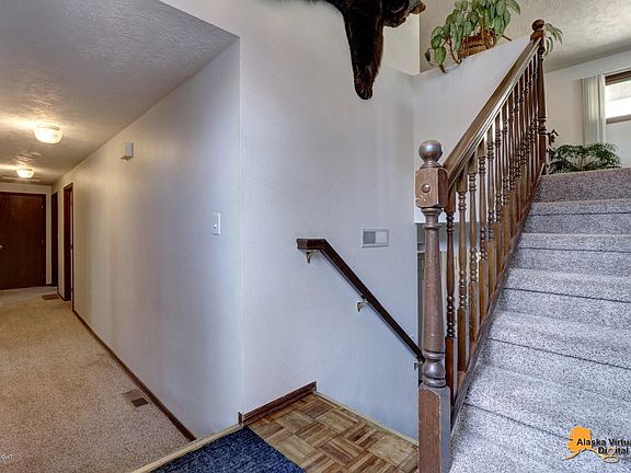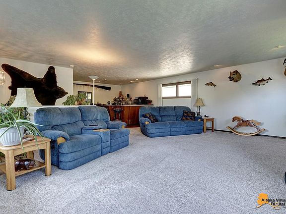 Large 3 bedroom home with a bonus bedroom/office. Downstairs area has a family room, bedroom and full bathroom. Upstairs has a built in bar and living area. Extremely well manicured lawn with a privacy fence, oversized 2 car garage for all your Alaska toys!