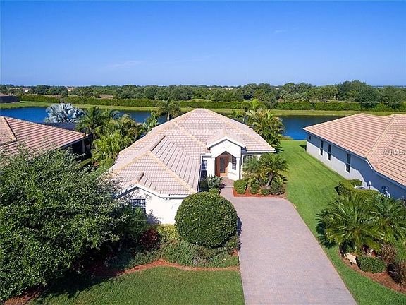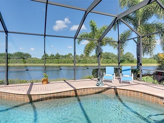 Endless sunset & water views and a fantastic open floor plan make this Key West model the perfect home for your Florida lifestyle! This GOLF membership included home in River Strand Golf & Country Club allows you to only pay cart fees and enjoy all amenities! What curb appeal- side entry garage, brick pavers, tile roof, and owner added landscaping and exterior lighting! Once inside the view through the aquarium window and triple sliding patio doors is breathtaking. The expansive kitchen allows you to cook and converse with your guests with the pass-through into the dining and great rooms. The upgraded granite, stainless steel appliances and numerous hardwood cabinets are all top of the line. The den can act as a 3rd bedroom if necessary with a pull-out sofa while the other two bedrooms are spacious and both feature walk-in closets. The master is truly the owner's retreat. Relax and enjoy the view, walk out to your lanai or lounge in the garden tub. Additional upgrades include: new AC 2017, lighting, ceiling fans, wood flooring in den, upgraded carpet and padding in bedrooms, surround sound inside and out, new pool pump in 2016, tile roof power washed 2017, custom dolphin water feature in pool, oversized 85' front lot with $55K lot premium with private water view! Furniture available under separate contract. $2700 River Strand capital contribution and $500 annual restaurant minimum.