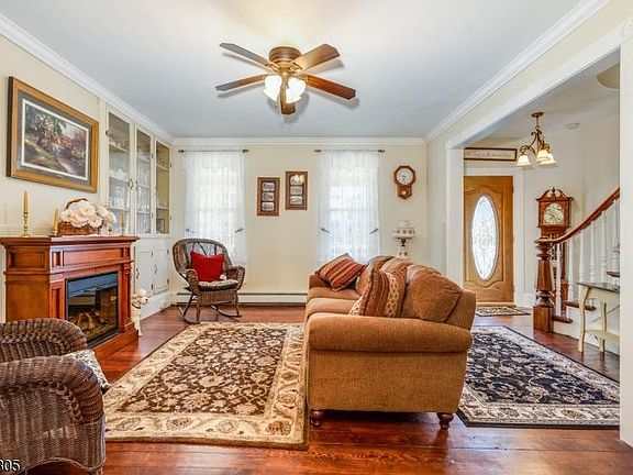 Gracious 1880's colonial home with wrap around covered front porch. Situated on 1/2 Acre in the Village of Sergeantsville, serviced by public sewer and public water. Entrance vestibule opens to living room with crown moldings, built ins and decorative electric fire place. Dining and Living rooms both feature beautiful walnut floors. Updated kitchen features lots of cabinets, range, microwave oven and dishwasher. Access to side deck and porch is available from kitchen and expansive family room, great space for large gatherings. First floor master suite has a walk-in closet, entry to full bath with dual vanity and shower. Convenient first floor laundry hook ups. Second level has 2 bright bedrooms, sharing full bath with tub/shower. There is a walk up attic for easy storage. Partial basement with inside entry has updated mechanicals. Landscaped yard with carriage style storage shed. This home is move in ready. Located midway between Flemington & Stockton.