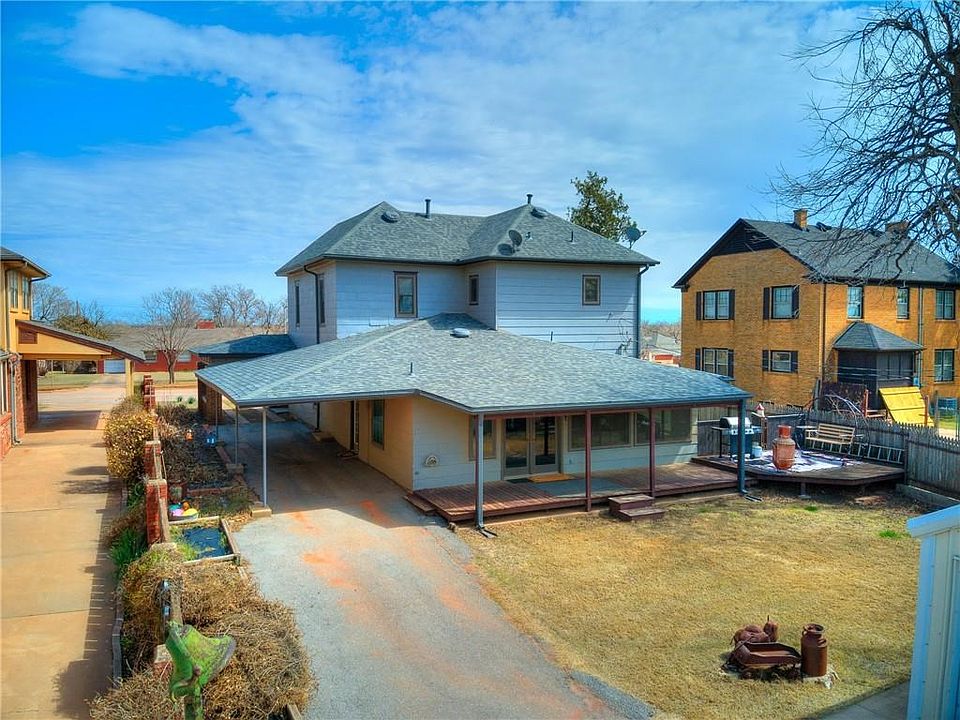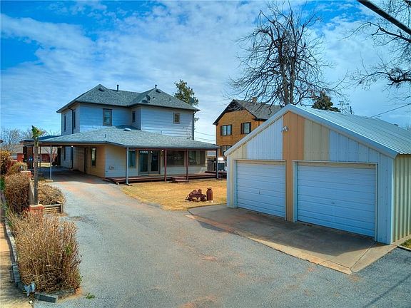 Historical home with a small town life! This 2782 sq/ft charmer is a 4 bedroom, 2 1/2 bath beauty! New Andersen double pane Energy Efficient windows throughout this incredible find! Kitchen is complete with stainless steel commercial sized refrigerator/freezer and upgraded appliances, oak cabinetry, and a freshly painted exterior make this home a "move in and enjoy" type of home. The original features such as the wood flooring, thick baseboards, and ORIGINAL staircase are unseen in homes of today. The tin ceiling adorning the living room boasts it's history. Large bedrooms throughout w/ deep closets. Additional living area/dining room off the kitchen hosts a half bath & could serve as an office. Basement storm shelter is a large useable space for storage. Backyard includes a large deck and metal shop/ 2 car garage. *Generac Generator* New roof ! Pack your rocking chair and relax on the large covered front porch, overlooking Main Street! 40 mins to OKC! Owner relative to Realtor.