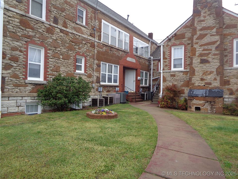 Building was constructed in 1945 and has been well cared for. Step into a spacious bonus area that is tiled with high ceilings, Apartment is approximately 900 sq ft. All rooms have high ceilings. hardwood floor in nice size living room with ornamental fireplace, dining room, cute mini kitchen, carpeted bedroom, and full hall bath. Laundry on site.
