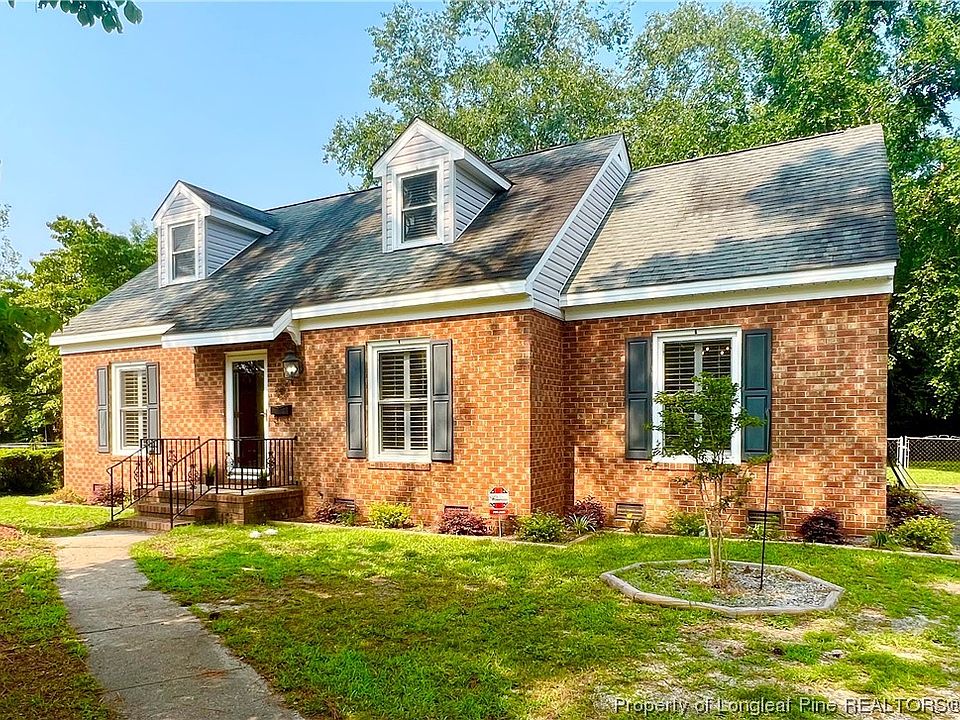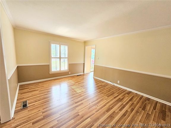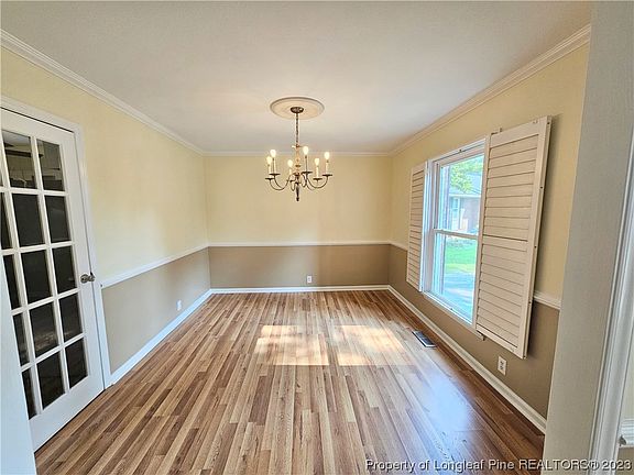Move in ready! Gorgeous!-4 bedrooms & 2 baths with tile showers, all wood floors and modern stainless steel appliances! with nearly 1900 sq ft. of living space this home host two bedrooms downstairs and 2 bedrooms up, the laundry room offers built-ins for storage; the kitchen features gourmet chef luxuries-granite counters and a gas range! With a stunning formal dining, a cozy living room and den to host family & friends! Walk in attic access; spacious fenced backyard w/patio & wooded lot line. Mins to Fort Liberty and 295!