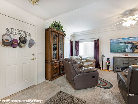 Come see this beautiful 1,282 sq ft 2 bedroom 2 bath upstairs condo with views of park and bluffs beyond. This condo has been remodeled with marble countertops and lowered kitchen bar which makes the living space feel very spacious. New stainless steel electric stove with air fryer built in makes for great easy fast meals or warm ups, kitchen boasts subway tile backsplash for that extra touch. The condo has had new carpet installed with upgraded padding that feels great on you feet and legs. Owners installed a barn door on main bath to separate bedroom from bathroom. Sit on the patio and look out over the green park and trees with bluffs views beyond or go lay by the heated pool and spa on site. This is also associated with Mesquite Vistas so you get the use of their gym, pickleball and tennis courts, horse shoe pits and beach volley ball. Let's not forget the 1 car detached garage that comes with the property. Come see this Great property.