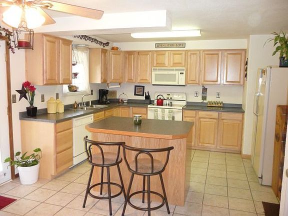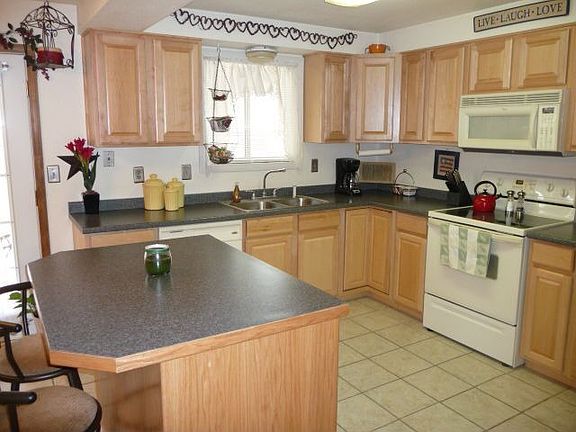 Large living room with laminate wood flooring, tile floors kitchen & dining room. Roomy kitchen features breakfast bar, island, newer Maple cabinets, tons of storage & two year old appliances. Updated bathrooms have tile surround & floors. Enormous back yard with covered patio, auto sprinklers & a storage shed. Vinyl siding, newer windows & four year old roof.