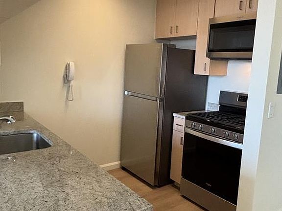 Kitchen and bathroom both feature oak cabinetry. Kitchen includes grey, granite countertops and stainless-steel appliances. Bathroom includes cream terrazzo countertops and tiled flooring; hard surface flooring throughout remainder of home.