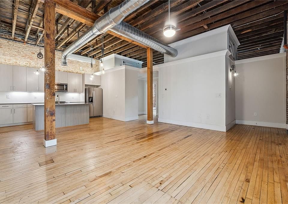 An unparalleled opportunity awaits you to possess a concealed gem from Atlanta's 1920s historic industrial edifices, ingeniously transformed into contemporary lofts. Meticulously refurbished, this loft seamlessly integrates original elements, unveiling exposed brick walls and expansive picture windows that reach towards lofty ceilings adorned with captivating beams. The resplendent hardwood floors evoke a nostalgic journey through time. Nestled on the top floor and occupying a coveted corner position, this loft bathes in an abundance of natural light, enhancing the allure of each corner of the home. Open-concept layout overlooking the living room, featuring an expansive kitchen with an oversized quartz island, adorned with stainless steel appliances. Luxurious custom-tiled showers harmonize with quartz countertops throughout the space, elegantly uniting functionality and aesthetic allure. Within mere minutes on foot, you'll find yourself at the doorstep of the Mercedes-Benz Stadium, Castle-Berry Hills District, boutiques, restaurants and more. Conveniently located just a short twenty-minute drive from Hartsfield Airport, this locale seamlessly blends urban vibrancy with accessibility.