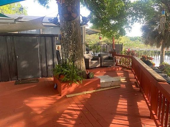 55+ Gated Community..... One of a kind custom home directly on Braden River with dramatic views of River and Island. Wake up in either of the 2 bedrooms with stunning views of the River and impeccable landscape. Both custom bathrooms have unique art tile, master bath has huge walk in shower with glass blocks that light up and rain fall shower head. Kitchen has upgraded appliances, granite countertops, gas range, side by side fridge, microwave, plenty of quality cabinets and pantry. Incredible mermaid tile mosaic on kitchen wall. Living area has tinted windows, Big screen TV and fireplace heater. Home is fully furnished ! The back deck is right on the river nestled in giant Oak Trees. This custom home is the envy of the neighborhood and it truly is One of a Kind. Home is located in upscale gated community close to shopping and restaurants. Lot lease is $1027 a month, includes lawn care, tree trimming, leave pick up, trash pick up, community maintenance, tennis courts, POOL, clubhouse, Island nature walkways and much much more. Live on vacation everyday in this resort river community.