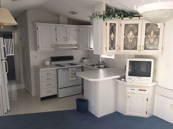 This one bedroom one bath deluxe park model is located on a corner lot The exterior boasts an oversized concrete driveway and a carport for two cars. This one owner home has been well maintained. It is being sold unfurnished, but with all appliances including a washer and dryer. The home has custom vertical blinds, central A/C and heat. The lanai added in 2000 and offers privacy windows. There is a screened porch w/ cement patio and insulated roof over the whole home. Call today for more information or to set up an appointment for a tour.