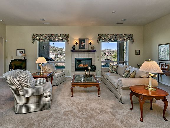 A HIDDEN GEM! Beautiful single level custom home near Natl Forest w/private mountain views and sounds of seasonal Lynx Creek. Radiant floor heating, 2 gas heating units, 2 fireplaces, 2 a/c units, fenced irrigated garden, dog run, outdoor fireplace, multiple patios, surround sound in every room, plumbed for central vac, 2nd Master Suite, lighted art niches, wet bar w/wine cooler, Quartz counters, Lg kitchen island, double ovens, 5 burner gas cooktop, built in full size freezer and full refrigerator, slide outs in cabinets, RO system for entire home and detached workshop/garden shed. This home has everything!A peaceful private retreat yet 3 minutes to the mall and Trader Joes.
