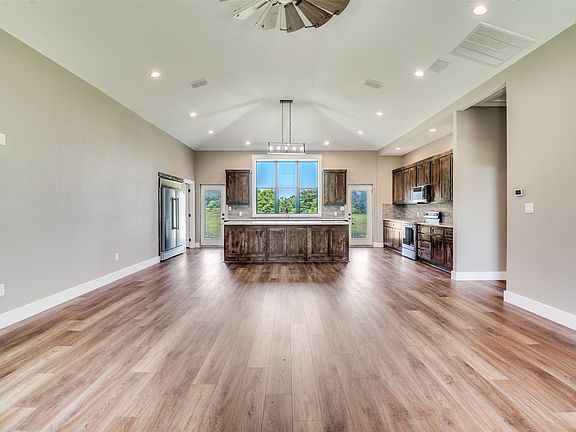 New Construction and completed in 2025, this beautiful modern farmhouse inspired home sits on 4.5 acres, has a a 30x40 detached shop with 2 garage doors and extra space for toys. As you enter the home, you are greeted with an open concept main living room, LVP wood look flooring, vaulted ceilings, LED lighting, and tons of natural lighting! The luxury kitchen is equipped with beautiful wood shaker style cabinets, granite countertops, designer lighting, stainless appliances with commercial grade double door refrigerator! Bonus room off the kitchen can be used as a large pantry, office, craft room or a 3rd bedroom! The primary bedroom has a beautiful view of the backyard through the double window, and has a large private bath with gray slate look tile, dual sinks, and large walk in shower! Additional features include ceiling fans in all rooms, laundry room with granite countertop and additional sink, spray foam insulation with double insulated walls, brand new aerobic system, private water well! The 30x40 shops has 1200 square foot of space to make your own with 2 garage doors to park cars plus additional space for toys or a work shop!