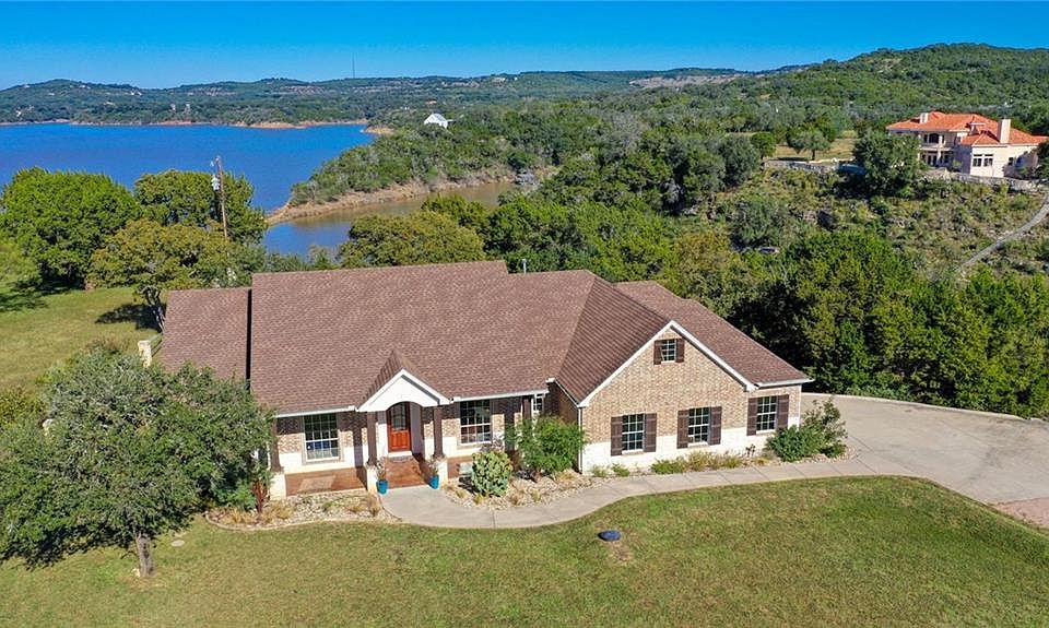 Upon entry the view of Lake Travis is amazing! Custom one-story w 250' of waterfront near Lago Vista. Outside: 3 entertainment areas-#1 outdoor kitchen/TV/fireplace, #2 dining/hot tub, #3 lake dining/grill. Easy walk/golf cart to steps leading to custom built self-leveling dock w composite decking, boat/jet ski lifts/storage room. Flood insurance not required. Less that 15 min. from marina/fuel and Lago Vista groceries, restaurants, CVS, gym and more. 3 golf courses within 30 min. Horses allowed.2.79 acre