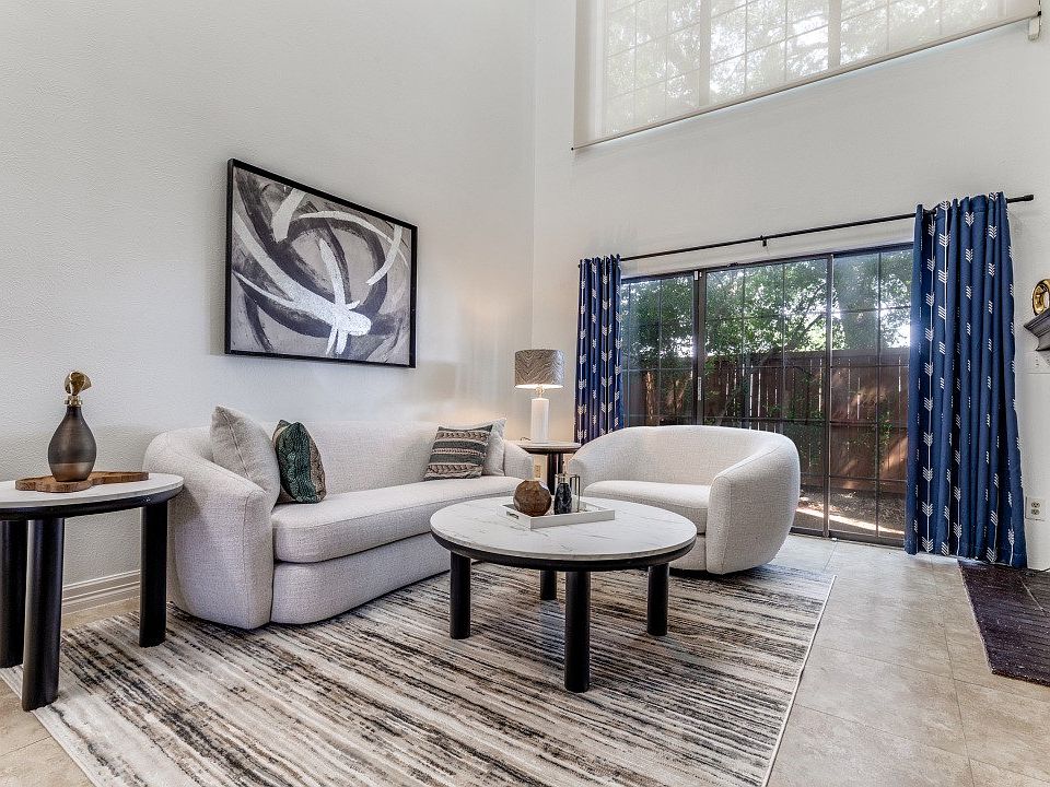 Experience sophisticated living in this stunning two-story condominium, offering 1,013 square feet of beautifully designed space with 1 bedroom and 1.5 baths. The expansive living room boasts dramatic 20-foot vaulted ceilings, a striking wood-burning fireplace, and custom built-in bookshelves that create an elegant yet inviting atmosphere. An architectural spiral staircase leads to a versatile loft with a built-in desk, ideal for a refined home office, guest suite, or second bedroom. The primary retreat opens to a private balcony, perfect for morning coffee or evening relaxation, while the spa-inspired full bath features an oversized shower for a touch of luxury. Completing this exceptional home is the convenience of an assigned carport with additional guest parking, all within the sought-after Dallas ISD zoning for Anne Frank Elementary, Benjamin Franklin Middle, and Hillcrest High. Designed for both comfort and style, this residence offers the perfect blend of sophistication, versatility, and convenience.