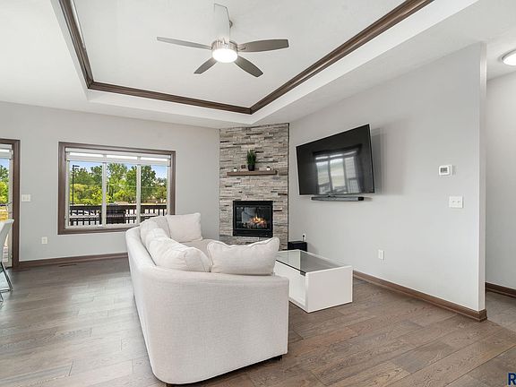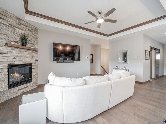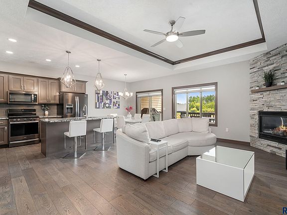 Like-new 4 bed/3 bath twin home in east Sioux Falls with gorgeous finishes throughout! Granite countertops, beautiful cupboards & a walk-in pantry in the kitchen. An open concept layout connects the dining and living rooms, with a sliding door to the covered deck. Mostly fenced backyard offers a patio with firepit & underground sprinklers. Hardwood floors throughout the main living area is complemented by a tray ceiling and gas fireplace in the living room. Owner's suite boasts a stunning bath with tile shower, soaker tub, double vanity, tile floor & spacious walk-in closet. Convenient main floor laundry has lockers and a stylish barn door. Fully finished lower level includes a family room with second gas fireplace & granite wet bar with wine fridge. Two additional bedrooms with walk-in closets, a full bathroom, and utility room with ample storage complete this 2,645 sq ft home. Epoxy floor, gas heater, hot/cold water & floor drain in the double garage. Close to Dawley Farm Village!