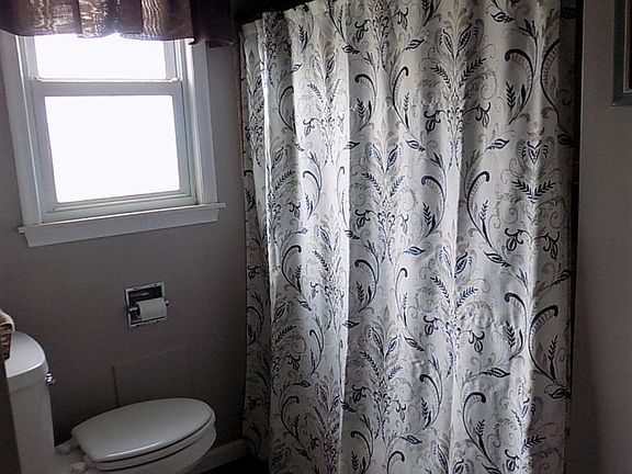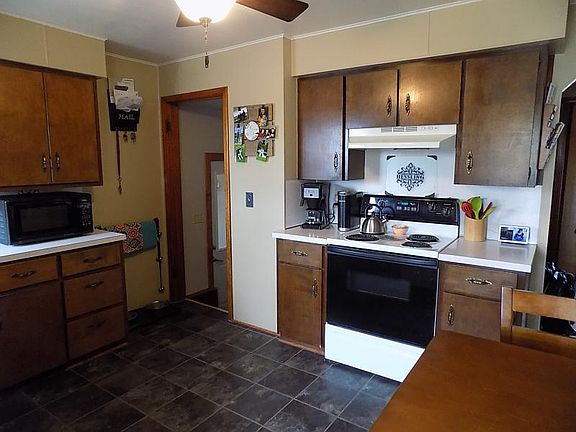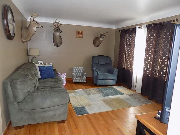 Nice 3 bdrm, 1 bath home with attached 2 1/2 car garage. This home offers an eat in kitchen with new vinyl tile flooring added in 2018. Living room (15' 2" x 11' 6") with hardwood flooring and cove ceiling. There are 2 bdrms on the main floor with hardwood flooring and a full updated bathroom. Large bdrm upstairs 11' x 15' 4" and landing with new carpeting added in 2016. Other updates include new flooring in breezeway, fresh paint throughout and updated light fixtures and ceiling fans. Full basement with laundry hookup and attached insulated 2 1/2 car garage with wood burning stove. Large yard, circle driveway and two additional storage sheds.