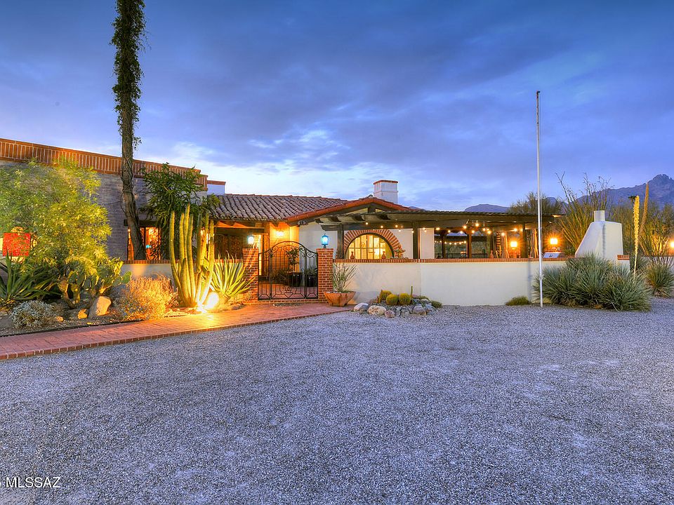 A captivating home full of charm and character, this stunning burnt adobe home is surrounded by the serene beauty of the desert. Mission-style roof tiles and vibrant desert plantings frame the inviting front courtyard, complete with a Ramada, a fountain, a cozy kiva fireplace, and a built-in BBQ area - an ideal space for gathering and entertaining.Step into the grand foyer, where wood-beamed ceilings set an impressive tone, leading to a spacious living room adorned with a stone-faced fireplace and a generously sized hearth. Expansive windows fill the home with natural light, offering uninterrupted views of two lush desert acres & the breathtaking Catalina Mountains.The dining room exudes warmth, while the Cook's kitchen, designed by AZ Design, boasts a large central island topped with gorgeous Quartzite counters and complemented by a chic subway tile backsplash. A Sub-Zero refrigerator, double ovens, and a quaint breakfast nook enhance its functionality. Adjacent is a separate pantry and laundry area, complete with a convenient half bath accessible from the pool. Throughout the home, colored concrete floors add a distinctive touch. The den features a cozy beehive fireplace, and a dedicated office includes built-in bookcases, perfect for quiet study or work. The primary suite offers a tranquil retreat, showcasing an ensuite bathroom with double sinks, custom alder cabinetry, and concrete countertops. Two additional bedrooms share a beautifully remodeled hall bathroom, while a fourth bedroom enjoys the privacy of its own ensuite bath. The backyard is an entertainer's paradise, featuring a newly resurfaced pebble-tech pool and spa with updated equipment (2022-2023) and a new gas line to spa. The expansive Trex deck, stretching the full length of the home, offers a peaceful space to soak in the panoramic mountain views. A Ramada provides shade, completing this exquisite outdoor sanctuary. With owned solar panels and one newer HVAC unit, this home is not only beautiful but energy-efficient, a perfect blend of luxury and sustainability in the heart of the desert.