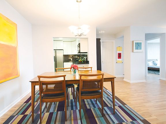 Beautifully renovated home w/open floor plan & gorgeous sunset view via floor to ceiling windows. Feat: large balcony, 2 walk-in closets & kitchen's granite counters, marble floors & SS appliances. Plus garage, 24hr desk, pool, gym & sauna! Walk to Friendship Heights Metro, shopping, dining, etc. Fee includes utilities & 15-year $110/month special assessment. Bldg reno done by 9/14.
