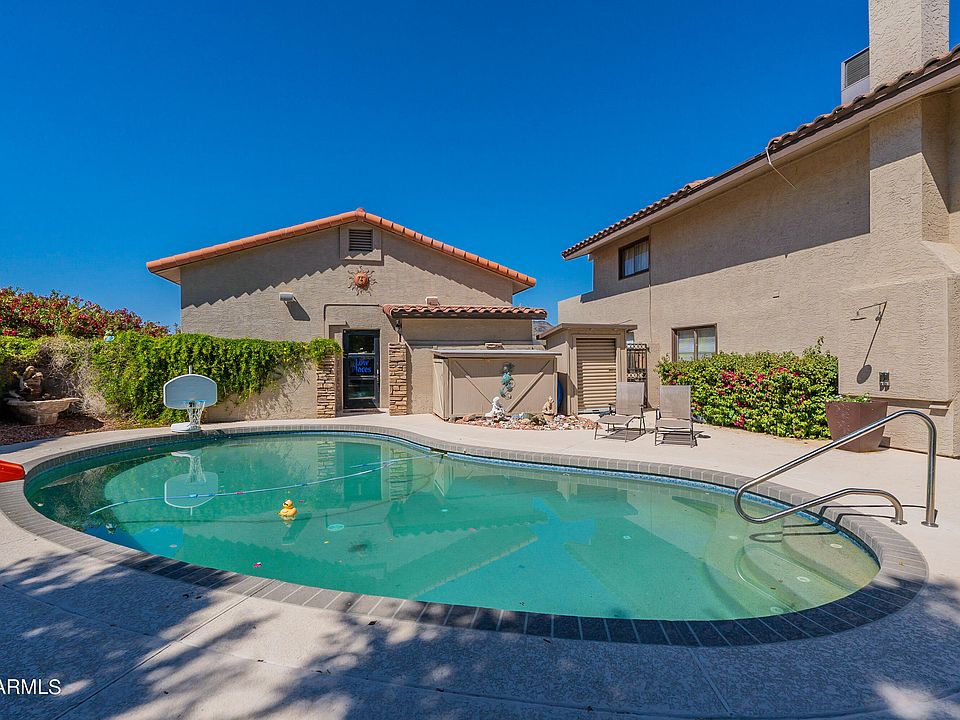 Over an acre and No HOA! Beautiful North Glendale Oasis nestled in this community of custom homes with a stunning mountain backdrop! Imagine your family enjoying life with room to roam on this acre plus property! Room for all the toys. Over 2400SF of living space, not including the 1100SF shop/party room/guest house, adjacent to the pool area with outdoor kitchen and bathroom! The home includes 4 bedrooms and an office/den space that could be used as a 5th bedroom, plus 3 baths. One of the bedrooms and baths in on the main floor, perfect for guests. There is a wood burning fireplace in the family room and a huge balcony off the primary where you can take in the views! The back half of the property offers a convenient entrance off 51st Ave. So much potential, perfect the way it is
