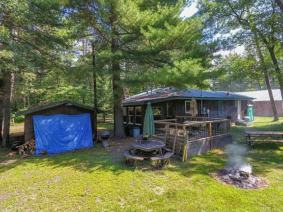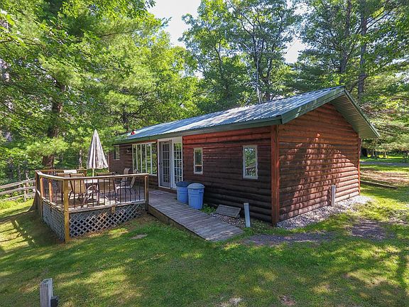 4 season home has log exterior & knotty pine interior. Updated kitchen. Wood burning fireplace. New metal roof. One car garage & workshop/storage building. Appliances & furnishing included. 6 panel doors. 1/2 log siding. Large deck facing water. Laundry area is in this unit. Original stone rock wood burning fireplace. Enjoy boating, fishing, swimming on pristine Eau Claire Chain of Lakes in the Summer & plenty of Winter fun, too! Seller putting in path for ATV's to the water.