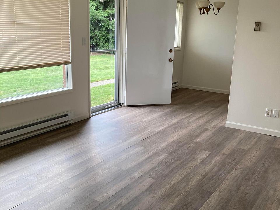 Rare vacancy in small 12 unit apartment complex that encumpasses a grassy courtyard. The is a single story building, so no noisy neighbors above you! The unit is freshly painted, has new luxury vinyl plank (hardwood like) flooring, new window blinds, new baseboard heaters, new dishwasher, a builtin microwave above the range, full size refrigerator and a nice storm/screen door. There is also a lot of closet space and pantry storage. The rent of $1,195 per month includes water, sewer and garbage, an assigned carport parking space and generous sized storage locker. There is an additional $35 per month for a second occupant. A cat is allowed. Sorry no dogs. For a qualified tenant, move in costs include: First month's rent and $1,000 security deposit. One Year Minimum Lease Term. Move in costs for qualified applicants include: 1st month's rent and $1,000 security deposit. There is a $250 additional pet deposit (cat only, sorry no dog). Rent of $1,195 per month covers apartment, water, sewer, garbage, storage locker and assigned carport space. There is an additional charge of $35 for two occupants. Tenant pays electricity, phone, cable and internet directly with utility and service providers. Tenant screening cost is $50/adult applicant and resident. Tenant screening is done through the Rental Housing Association of Washington. Please request an application form.
