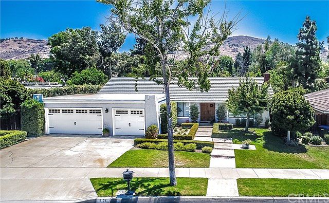 If your client wants privacy, tranquility, and a beautiful pool & spa in your backyard, I'VE GOT THE HOME FOR YOU! Besides backyard beauty, you also get a wonderful view of the mountains through the trees. This SINGLE STORY, 3 CAR-GARAGE home has a stately, yet simple elegance to it, and the well-thought-out yard has been impeccably groomed in both front & back w/mature growth all around. From the moment you enter through the double wood doors, this home captivates you with its comfortable, homey charm. The family room is nicely sized and has a gas fireplace for making it cozy. From there, you are drawn into the dining room and redone kitchen. White cabinets, wood ceiling, neutral tile floor pavers and brown Caesarstone counters make this kitchen not only lovely, but enjoyable to work in. Don't forget the double ovens gas stove & stainless dishwasher. The natural light let in from the french patio doors make this kitchen space so inviting, you just can't wait to sip your coffee here! This home has 3 bedrooms, w/poss. 4th room currently being used as a T.V. room, that has a warm, rustic wood ceiling. The master bedroom has french doors opening to the serene backyard, making tiptoeing out for a midnight swim a tempting idea. You just CAN'T BEAT this neighborhood...near Villa Park, has great schools, easy access to FWYS, yet quiet from the noise. Oversized shed on side yard & tool cubby in the garage is not to be missed. NO HOA's either! Could this be your next home?