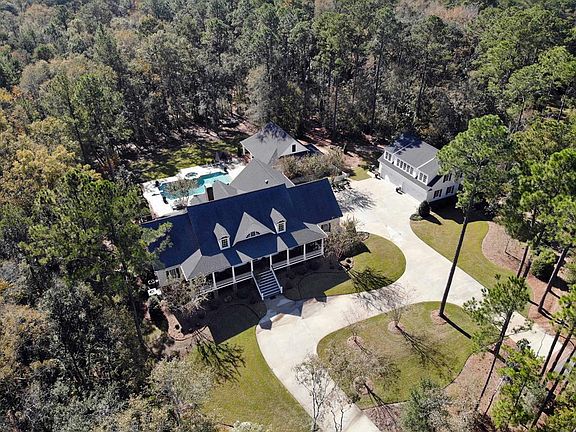 Southern Retreat! This stunning, custom built home sits on +/-80 Acres of private serenity! The main house features 7 Bedrooms, 6 Full & 2 half Bath rooms, Open Floor plan, lots of natural light, gorgeous heart pine flooring, rocking chair front porch and rear screened porch! As you enter the front door you are immediately welcomed by 12ft ceilings and then 2 story cathedral ceilings in the Great Room. The handsome painted brick fireplace is the main focal point of the room and stretches floor to ceiling (built as wood burning but converted to gas). The kitchen is a chef's dream with a breakfast bar, center island, 6 burner gas stove, warming drawer, leathered granite and cherry wood island countertops and a HUGE walk-in pantry. The breakfast area is very spacious and features room for a 12ft table and overlooks the pool. Just off the back door entry (handicap accessible) is the half bath, drop zone with 6 locker cabinets and a LUXURY Laundry room! Windows overlooking the pool, built-in desk/ home command center, folding area, room for dog kennels and much more! WOW! On the opposite end of the downstairs you will find one oversized Guest Bedroom with a completely handicap accessible bathroom (this room could also be converted to a handsome study) and the Primary bedroom suite. This bedroom includes access to the rear screened porch and a spacious walk-in closet w/ center island, on-suite luxury bath with walk-in shower, free standing tub, storage, private wc and his/her sinks. Upstairs you will find 5 additional bedrooms (3 with private on suite baths and 1 with a shared jack/jill bath), hardwood floors, a second laundry room w/ half bath, walk-in attic access and large common sitting/ tv area off the landing area. Don't need 5 additional bedrooms upstairs? These bedrooms could easily be combined for large bedroom suites or multi-purpose rooms. This property also features an inviting pool/guest house with a full kitchen, large great room/ dining room w/ cathedral ceilings, full bath (w/ indoor & outdoor shower) and private bedroom w/ walk-in closet. The pool area is absolutely stunning with a sun shelf area for relaxing and a 12 person hot tub! Beautifully landscaped and every plant is irrigated for easy maintenance! The extra 4 car garage features rear covered storage + the second floor is finished for a huge bonus room, bedroom & full bath! The property has an established trail system, food plots, gated entry, chicken coop, fire pit and much more!