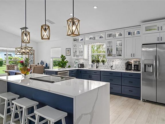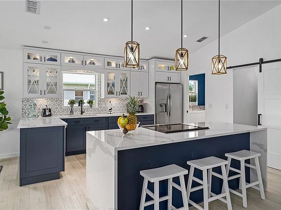 Gorgeous home! Attention to detail is evident throughout this entire home! Expansive modern floor plan with an open concept. Huge quartz waterfall island, all new SS appliances, designer cabinets and lighting. All new modern doors with black hardware throughout the home including stylish barn door to large walk in pantry with custom shelving. Sleek primary bedroom design with expanded, custom walk in closet. Primary bathroom has double sink, designer vanity and walk in shower. Plenty of natural light and cathedral ceilings makes this home bright and airy. Watch spectacular sunset from your living room or the oversized screened in lanai! Double garage with fresh, epoxy floor finish. Insulated attic space above the garage and a storage shed outside. One of a kind home!