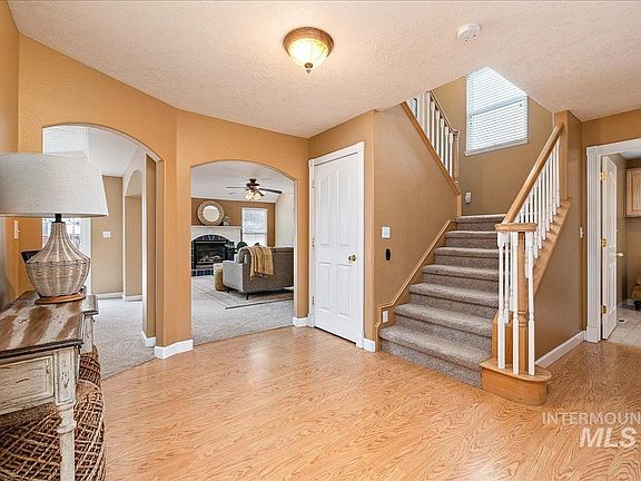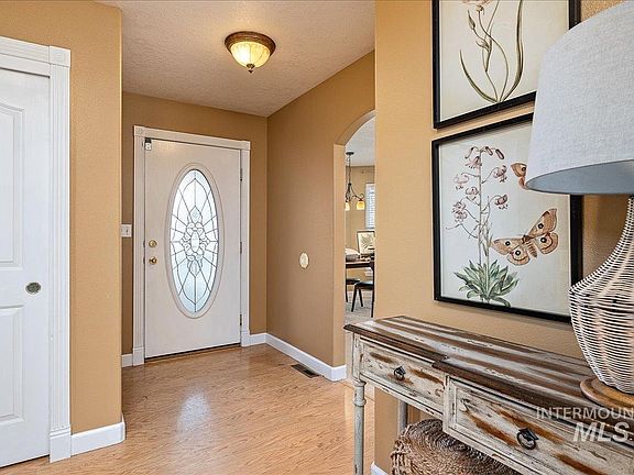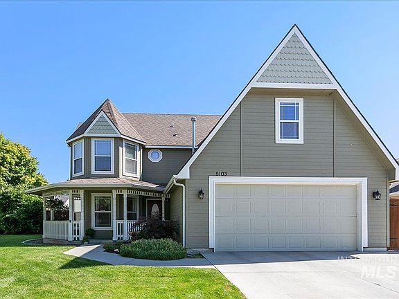 Curb appeal abounds in this charming Victorian style home with a large wrap around front porch. Situated in a quiet neighborhood in NorthWest Meridian, this home is not your cookie cutter house! Enjoy entertaining in your large eat in kitchen and dining room with coffered ceilings. The living room that features a gas fireplace and skylights for extra natural light. A stamped concrete patio creates a beautiful outdoor living area in your manicured backyard oasis. Upstairs, large bay windows in the primary bedroom add character, along with a hidden office or workout room off the master bedroom. Outside, the shop has enough room for an additional car, or storing your toys. There is even additional room to park an RV! This home has great access to the new Costco, all the shopping, dining and entertainment in Meridian and Nampa. Newer HVAC unit, built in oven, microwave and water heater! It is just ready and waiting for new owners to make it their own! Schedule your private showing today!