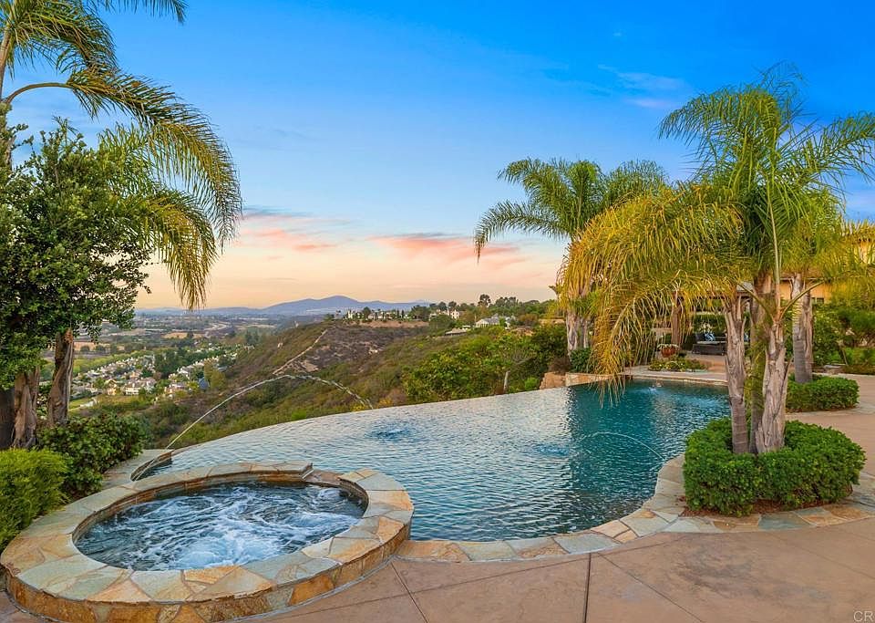 Premier Del Mar Mesa gated custom estate with breathtaking PANORAMIC VIEWS! Situated high atop the ridge-line with vanishing edge pool/spa on 1.12 acres, OWNED SOLAR + Tesla Powerwalls, and an expansive Entertainer's Backyard. Privately gated driveway leads to a 5 Bedrooms + Office/BR 6 abode with designer details throughout. Chef’s Kitchen w/ Dacor stainless steel appliances, elegant travertine flooring, crown moulding, raised/barreled ceilings, and TWO full bed/baths on the first floor. An elegant wrought-iron staircase leads upstairs to secondary bedrooms and an inviting Primary Suite with elegant spa/bath, private balcony w/ fireplace and forever views. Multiple French doors lead to your Entertainer’s Backyard featuring a vanishing edge pool & spa, fire pit, built-in BBQ, large grass lawn, and one of the best views Carmel Valley has to offer. Four-Car Garage with epoxy floors and built-in cabinetry, and close all the amenities Del Mar Mesa has to offer: Award Winning Schools, many miles of hiking/biking trails, Elizabeth Rabbit Neighborhood Park, close proximity to fine dining and shopping options, all married with the beauty and serenity of the nearby Los Penasquitos Preserve