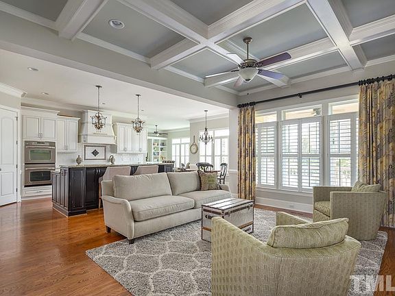 Sought after subdivision w access Umstead Park, com pool, near RDU/Rex Hospital! Luxurious 1st floor Master plan+1st floor Guest Suite+KeepingRm. Gorgeous Trim package with triple tray+coffered ceiling, wainscoting, BuiltIns, Oak hardwoods, 10+9ft ceilings. Spacious BRs. Double Bonus. 3890sqft/4Brs each with Bath and WalkIn Closet. 2 Attic Storage areas. 3CarGar. Front and Back Porch. CommunityPool+Clubhouse+ExerciseRm.