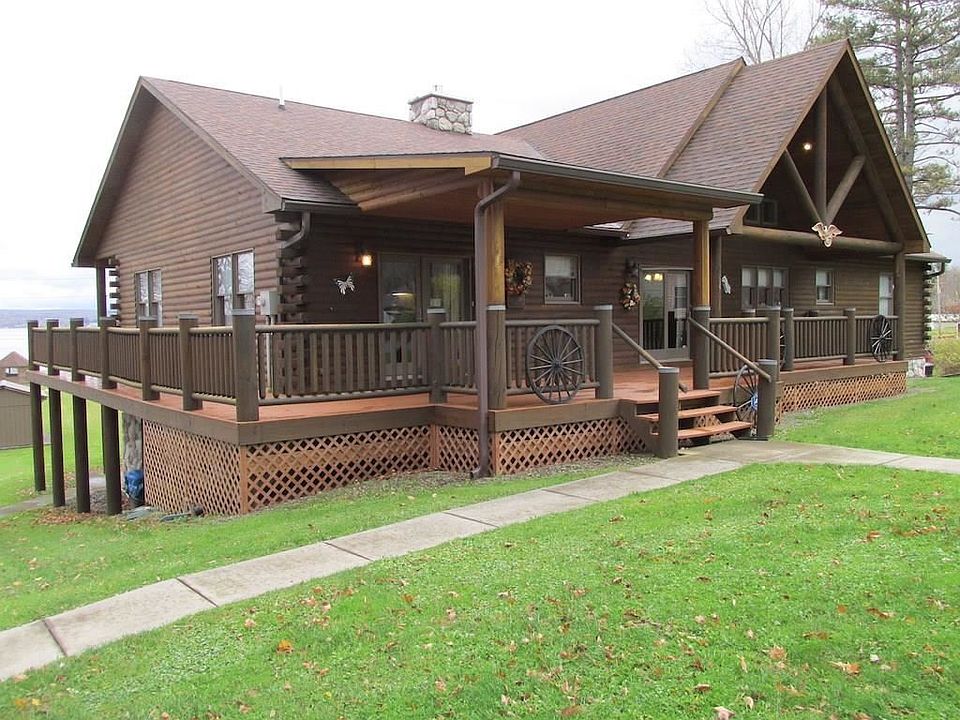 STATELY AND SPACIOUS, THIS CUSTOM BUILT, LAKEFRONT, LOG CABIN HOME (approx. 90' of lakefront), IS SITUATED ON 2 ACRES OF LAND, YET CLOSE TO EVERYTHING! Located just minutes to Chautauqua Institution, this cozy and comfortable home features a 4 car Garage, lakefront Gazebo, storage shed, 5 Bedrooms, 5 Baths and extra rooms for a total of over 5000 sq. ft. There's a Mud room with laundry area, Kitchen with Breakfast Counter & Pantry, Dining area, Great Room with vaulted ceilings & access to the lake view Deck, Fireplace, open air Loft/Office, 2 Guest Bedrooms & Baths, & ensuite Master. The lower level has a complete Kitchen, Great Room, Den, Sauna, and 2 additional Bedrooms & Baths. THIS TRULY 'ONE OF A KIND' HOME HAS EVERYTHING YOU NEED TO ENJOY A LIFETIME OF HAPPINESS AT CHAUTAUQUA LAKE!