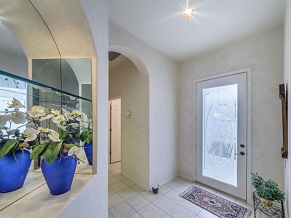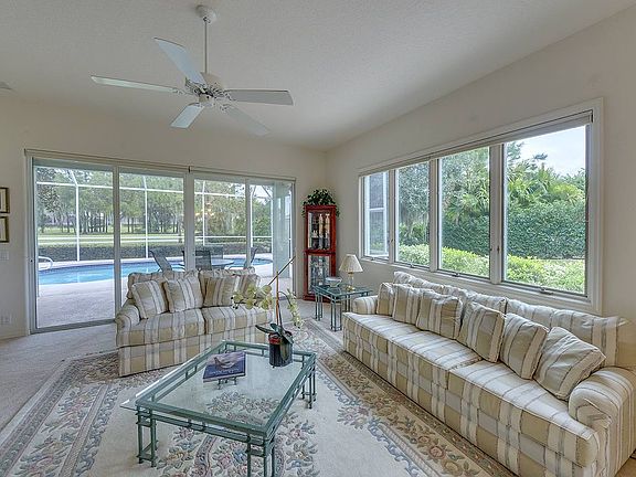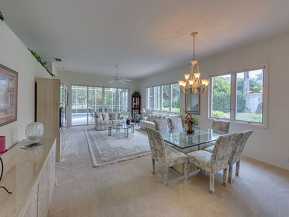 What a delightful open golf view is yours to enjoy from this wonderfully bright home, with 2 bedrooms, 2 baths, plus a den! You'll love the back Eastern exposure and the sparkling solar heated pool and spa. This great room plan home has lots of windows for natural light and views of nature all around, with no house to spoil the view. There is a lushly landscaped side brick patio with a gas bib, for the grill, and lots of room for sunning! The etched glass front door has a hidden "dream screen" to allow breezes to flow through the house. How nice! The kitchen has raised panel white cabinetry, a newer refrigerator, a newer dishwasher, a gas stove, a huge walk --in pantry, a handy chef's desk and sliders to the side patio. The Master bedroom suite has a wall of windows, to catch the light, and to enjoy the great view. There is a sliding glass door for easy access to the lanai and pool, an extra large master closet, a higher cultured marble counter with two sinks, a roomy shower, a big beveled edge mirror and glass block for light. Other important features include: A newer tank-less hot water heater; new A/C; pocket doors to the den, for privacy; newer Murphy "twin beds" in the second bedroom; a utility sink in the garage; newer front load washer and dryer, on pedestals, extra shelving and a folding table in the laundry room. Truly, this a delightful place to call home! The furniture is negotiable.