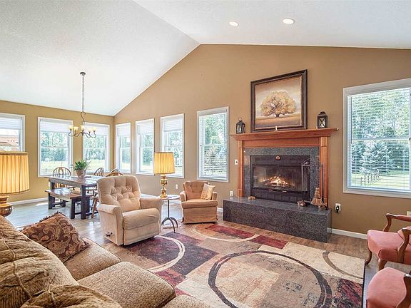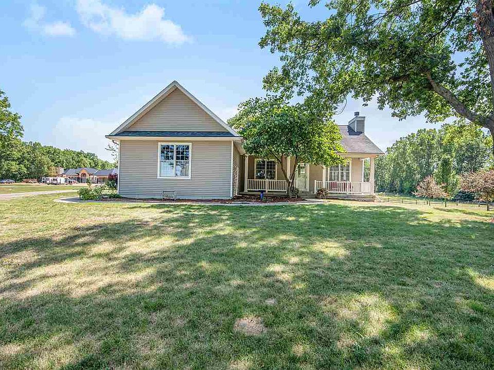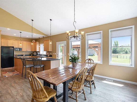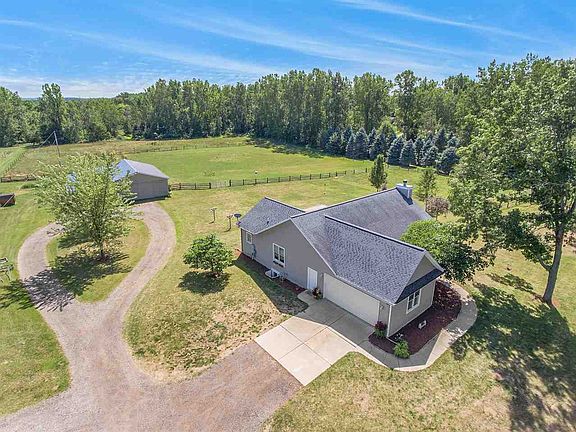Attractive 3B/R, 3 Bath Ranch House on 12+Acres. Built by MR builders and featuring: open floor plan, cathedral ceilings, fireplace, main floor laundry, finished basement w/ egress windows, geo-thermal heating/cooling, covered front porch, covered patio, 2-car attached garage, 50 x 46 pole barn w/ 2 horse stalls and fenced pasture.