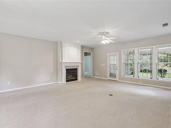 Move-in before the Holidays! ANOTHER PRICE REDUCTION!!! Move-In-Ready. Master-on-Main. Lawncare included with HOA. Freshly painted interior. Private backyard. Charming Craftsman-Style Ranch in sought-after Kingswood at Castleberry. A cozy and inviting 3-bedroom, 2-bath with open-concept living areas. Just minutes to GA400, The Collection, Northside Hospital, and the Cumming City Center and the new Whole Foods Market. This friendly, amenity-rich neighborhood offers a clubhouse, large pool, pickleball courts, dog parks, sidewalks, and an active social committee—ideal for anyone looking to settle into a vibrant, connected lifestyle. You will find excellent curb appeal with lush landscaping and a welcoming covered front porch to set the tone for this home’s warmth and charm. Inside, a formal foyer opens into a spacious Great Room with a gas fireplace and combined Living/Dining layout—perfect for entertaining. The Kitchen connects seamlessly to the Great Room and features granite countertops, a large island, warm cabinetry, built-in desk, and a sunny breakfast area—one of the largest kitchen layouts in the subdivision. A ramp with handrail from the garage leads directly into the Kitchen and Foyer, enhancing accessibility. The Master-on-Main Suite includes a wide double door entry, a trey ceiling, large windows overlooking the serene backyard, and a generous walk-in closet. The ensuite bath features dual vanities, a separate tub and shower, and an open water closet. (Note: minor updates could improve bathroom entrance, shower and closet accessibility.) Two additional bedrooms—ideal for guests, home office, or hobbies—share a full bath and are tucked away for privacy. Both bedrooms have ample closet space. A full-sized Laundry Room adds convenience. Listing agent has quotes for replacing carpet with LVP or updated carpet. The private backyard has a hill that could be planted in multiple colors of Azalea for a show-stopping view. The large covered patio offers a peaceful retreat and can easily be screened or converted to a 3-season room for additional year-round enjoyment. Outstanding entertainment space.