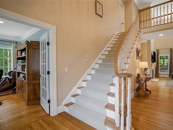 Incredible Wolfe Homes built Residence on Cul De Sac. Amazing curb appeal. Fantastic location with quick access to Highways shopping restaurants. Neighborhood adjacent to Greensboro Country Club golf course. 4 bedrooms 4 1/2 baths with room to expand in basement. 3 car garage and utility room with double door access. Wonderful Kitchen with Zline gas 6 burner range/Oven with exterior vented overhead exhaust. No HOA. Top rated schools. 2017 HVAC systems. New roof 2022. Large pantry with room for refrigerator. 2 large laundry rooms. Huge walkin linen closet. Elevator services all floors. Main level sound system with independent volume control for most rooms and deck. Solid core doors, vaulted great room, Simply Safe Security system, Generac 15,000 watt generator with dedicated electric panel, central vacuum, 8 zone sprinkler system. Unfinished basement has been plumbed with waste lines for bath and has hundreds of feet of shelving. Poured foundation walls.