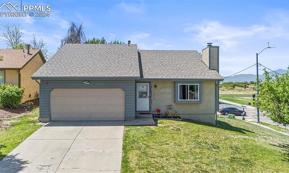 Welcome to this stunning open concept tri-level home situated on a desirable corner lot offering an exceptional blend of open design and welcoming mountain views! With 3 bedrooms and 3 bathrooms this home boasts a spacious and versatile layout perfect for both relaxation and entertaining. As you step inside you’ll be greeted by a cozy living room with a functioning wood fireplace. Ascend into the open kitchen complete with a pantry for ample storage and modern appliances that inspire culinary creativity. Whether you’re preparing a casual meal or hosting a dinner party, this kitchen is designed to meet all your needs! The primary bedroom along with a en-suite bathroom shares the same level creating a convenient and airy retreat filled with natural light. Two bedrooms and two bathrooms in the lower level complete this home providing functionality and privacy. One bedroom featuring an attached bathroom with the other bathroom providing laundry facilities. Enjoy the scenic views of Pikes Peak from the back deck. The corner lot provides a sense of space while the two-car garage offers convenience and additional storage. This home features a BRAND NEW roof installed 5/2024 and Furnace replaced 5/2023 offering peace of mind. This home is ideally located, with easy access to shopping, dining, and recreational facilities. With its desirable features and prime location, this tri-level home offers the perfect blend of comfort, style, and convenience. Don’t miss your opportunity to make this your dream home!