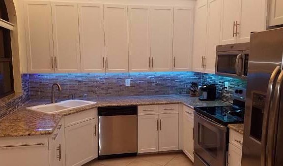 Fabulous location! Gardens of Woodberry is located right off PGA Blvd., across from The Commons. This three bedroom two and half bath townhome has a renovated kitchen with stainless steel appliances and granite countertops. Master bedroom with large walk-in closet on ground floor, two guest bedrooms and bath upstairs. Lush, tropical fenced in backyard, perfect for barbecuing, watching the dog or kids play. Two car garage with attic storage.