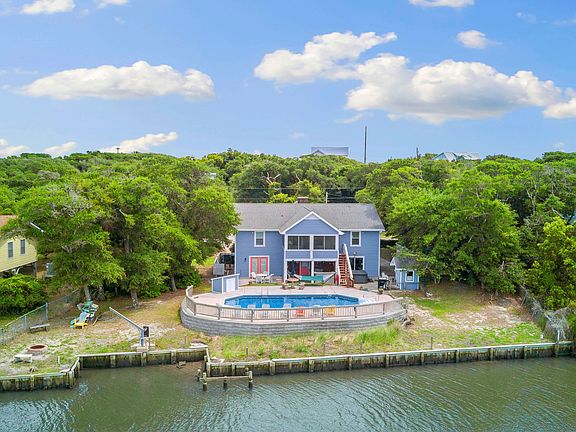 Views galore in this canal front home with easy access to Bogue Sound. Pool, hot tub, and lots of outdoor space in this lovely waterfront home. 3 baths, 3 bedrooms with additional rooms. Upstairs includes LVP flooring installed 2 years ago, large living/dining area, screened porch with removable screens accessible from the inside, sunroom overlooking the can and ICW, two bedrooms and a bath on one side and the primary bed and bath on the other side. New bottom cabinets in the kitchen. Additional bar area in the living room that could be used as dining space or an office. Work with a view! The bottom level was gutted after Florence and concrete board was installed with electrical outlets installed 4 feet from the floor. Downstairs includes another living area with French doors out to the pool area, laundry closet, bathroom, and two additional flex areas. From the additional living area downstairs there is an area that is enclosed on three sides with great views of the pool and canal. Enjoy the outdoors regardless of the weather! New garage doors were installed after Florence. New fire pit, new pool cover, second year for all equipment in the pumphouse, new hot tub. Privacy wall installed at the front of the house. Pool storage area. Storage shed as is. Furnished with few exceptions. Rented Through Sun-Surf Realty. Sat. turn day. Showing between 11 and 3 please. Square footage does not include sun room. Seller to do a 1031 exchange.