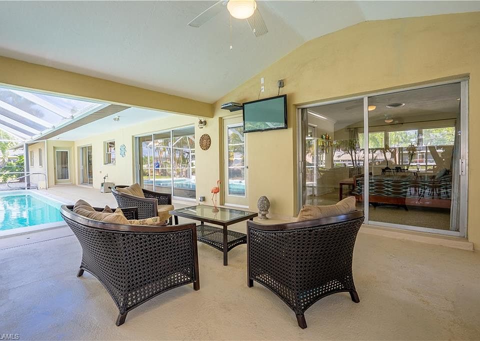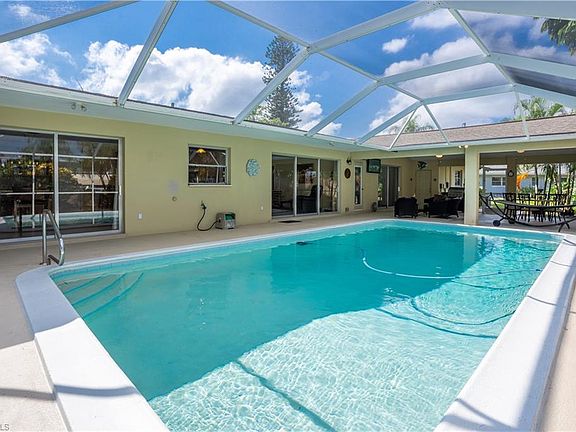 If Tropical outdoor living and quick convenient Gulf access on almost ½ acre of manicured property is what you're looking for, this is the one! Enjoy 133 feet of waterfront living on the Bimini canal with a brand-new Sea wall, & boat dock. Existing covered boat lift will keep your boat high & dry. This Stunning solar heated pool home on a dead-end street with very little traffic will impress even the pickiest buyers. The star of this home is the screened in Pool & 26 X 20 Concrete Trussed Outdoor Cabana addition with soaring ceilings, perfect for outdoor entertaining. Both bathrooms access the expansive pool & patio area. With 1648 SQ Ft under air, this wide split floor plan Ranch boost 3 Nice sized Bedrooms and 2 full baths. 2 car garage with a huge circular driveway. Nice sized kitchen & dining area perfect for entertaining. Boaters dream with quick access to the river & beautiful SWFL Beaches with 1 bridge to the river with over 9 feet of clearance at summer high tide. Property was used as a part time vacation home and can be purchased turn key completely furnished. List of upgrades available. Do not hesitate, call for a showing today. These rare types of properties sell fast!