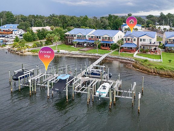 Welcome to Paradice, where you can enjoy beautiful sunsets over Pitts Bayou. This home offers easy access to deep water for boats with a 6-foot draft and includes a 16-foot wide boat slip. A full-service marina is just a quarter mile away. As you enter, you'll find 10-foot ceilings with recessed lighting throughout. The kitchen has dark wood cabinets and granite countertops, with a breakfast bar large enough for four. Just off the kitchen, you will find a full-sized washer and dryer with plenty of shelving behind double doors. The double garage access is located just off the kitchen, which includes an outdoor shower, laundry sink, and shelves on each side with plenty of counter space for all your tools and hobbies; back inside, you will find a half bathroom and a sizable closet. Back through the kitchen, you will find a living area fit for royalty with impressive 10-foot ceilings, upgraded lighting, and a Bay view captured through the large glass sliding doors that lead to a very large covered porch overlooking the Bay and dock, where you will surely enjoy many evenings with your nearest and dearest. Back inside and up the stairs, you will find the waterfront primary bedroom that features a private covered balcony, a vaulted ceiling, a walk-in closet, a soaking tub, and a separate shower, along with two more sizable bedrooms and a full-sized bathroom on the opposite side of the home. This one has it all and is ready for new owners, so call your favorite Realtor today for more information or to schedule a showing.