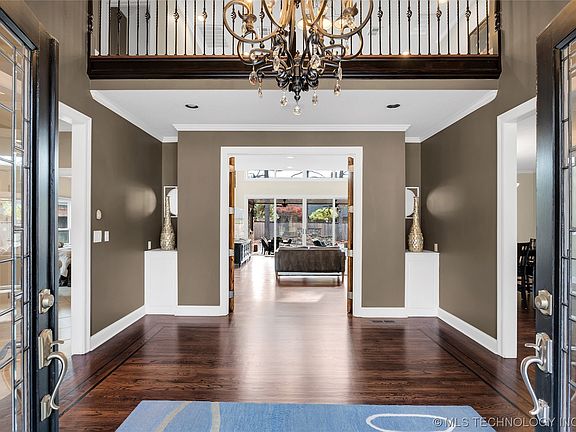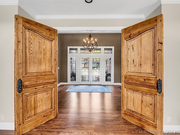 Beautiful Southern Oaks Home has everything you want but wish someone else had paid for! Seller upgrades during their ownership: Luxury kitchen with stained hardwood, soft close, Jay Rambo cabinets, Calcutta Quartzite on countertops & island, Bosch stainless steel appliances, convection microwave, Hoshizaki ice maker, & new pendant lights. Hardwood floors installed throughout the entire second floor. Beautiful hardwood floors & tile throughout the home. Office has updated bookcases with a new fireplace mantel & surround. New Anderson 100 Series windows throughout (all window trim also replaced with Fibrex, maintenance free composite) Exterior doors w/ interior blinds. New garage doors & openers. Ground Zero storm shelter in garage floor. Additional attic insulation. Plantation shutters on all windows. Also featuring an amazing backyard with stone accented fountain into the pool, a huge covered patio with a wood burning fireplace and a corner lot. The house has a very open, flexible floorplan. Jenks Southeast schools. Move in ready!