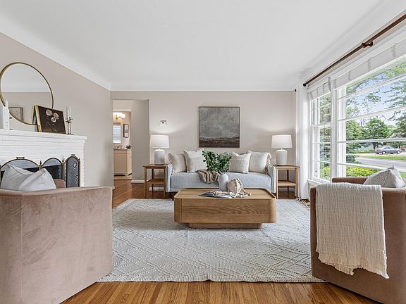 Step inside to find a cozy living space featuring cove ceilings, two wood-burning fireplaces, and beautifully maintained hardwood floors. The updated kitchen boasts stainless steel appliances, a quaint bay window with built-in seat, sleek quartz countertops, modern lighting, and a rare walk-in pantry, an exceptional find in homes of this era.